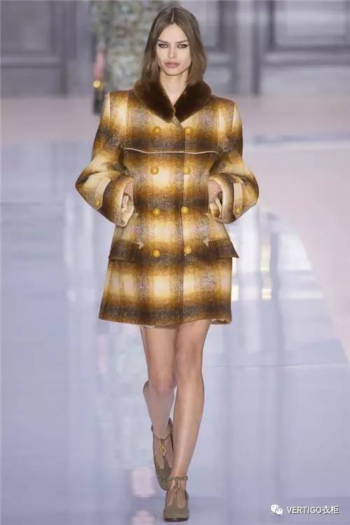 再让毛格纹羊毛、条纹羊毛皮和金色抓毛的上衣搭配上宽大的裤型,或是轻薄的碎花衬衫背心搭配皮革裙与玛莉珍跟鞋,就像正在看着一部复古电影,跟着模特儿的姿态,回到了怀旧的黄金年代。