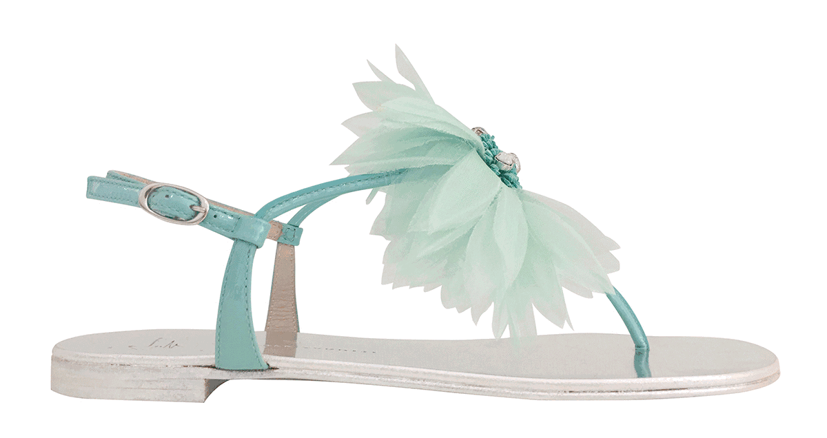 2018春夏另一系列以飘逸柔美的花卉作创作起点,片片花瓣以雪纺堆栈而成,轻巧灵动,随步履飞扬,不论是高贵大方的高跟鞋或休闲平底凉鞋都散发着浪漫梦幻感。