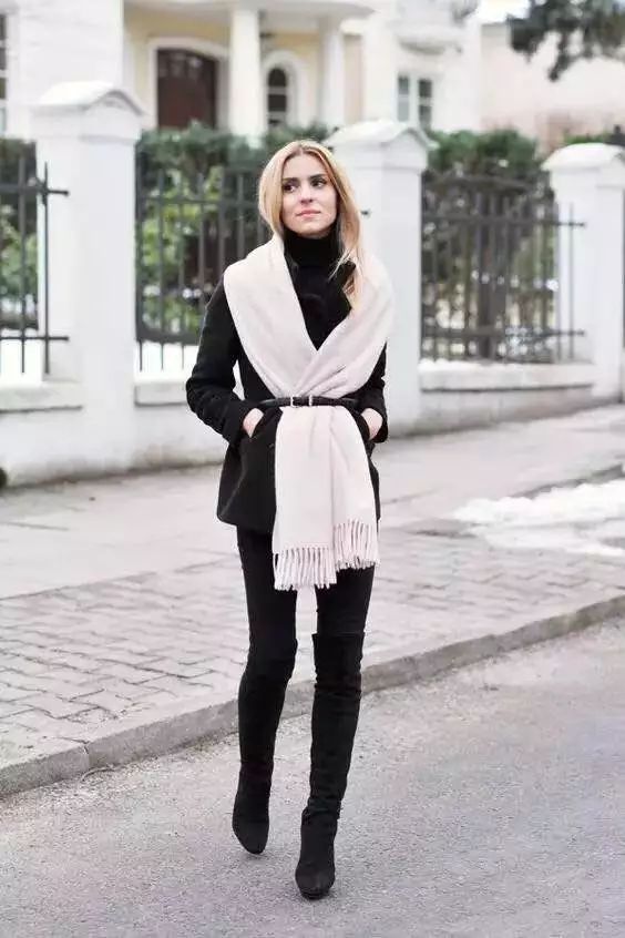 也可以搭配围巾,一身黑和纯白的围巾,造型看起来非常亮眼