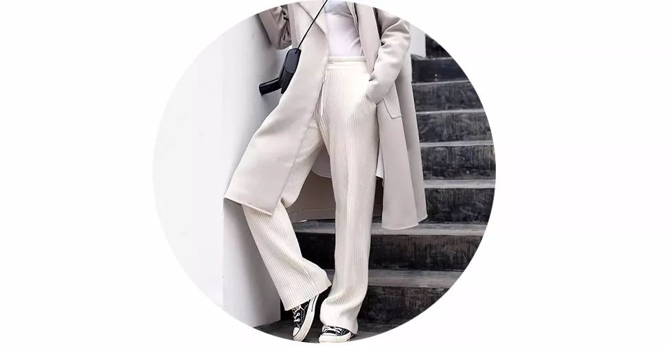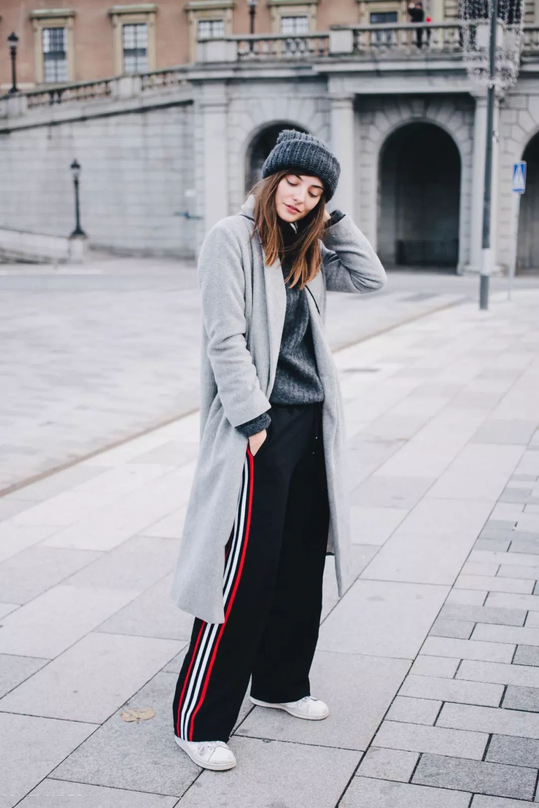 而阔腿裤的材质也不限,无论是西服裤,还是条纹运动裤、针织裤,搭配大衣运动鞋都妥妥的时髦。