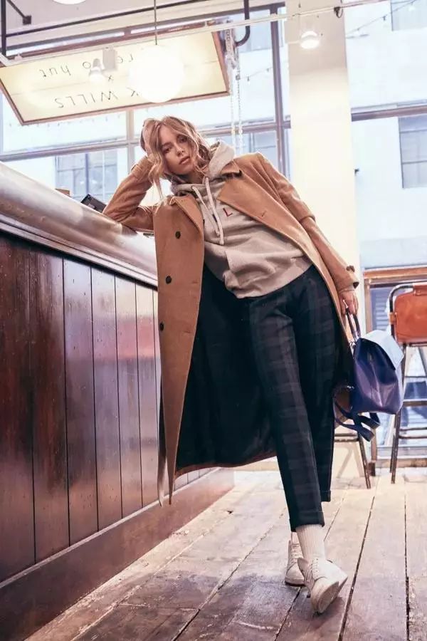 不过烟管裤和大衣搭配着会比较严肃一些,配上运动鞋就多几分休闲活力感了。