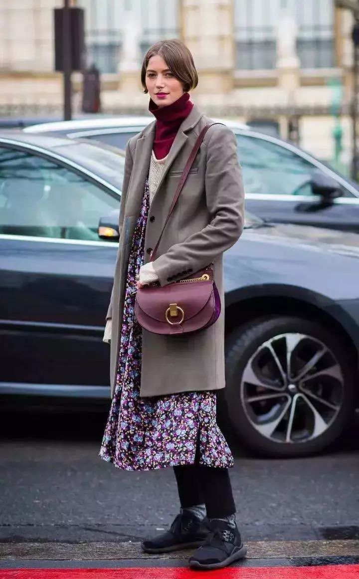 夏天的吊带裙,冬天叠穿高领衫配大衣不要太实穿,还可以学时髦精们玩转裙子搭裤子的时髦,配一双运动鞋,混搭得毫无违和感。