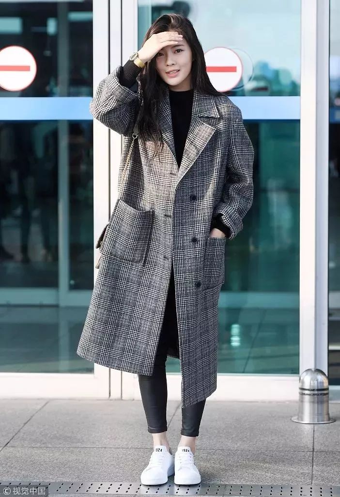 李善彬灰色格子大衣黑色紧身裤,脚穿白色系带休闲鞋,也尽显甜美时髦。
