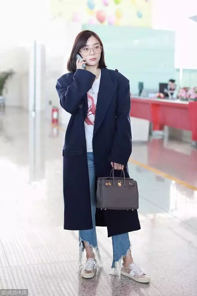袁姗姗藏蓝色廓形垫肩大衣,内搭白色印花T恤,下穿毛边九分牛仔喇叭裤,脚穿金粉色运动鞋。
