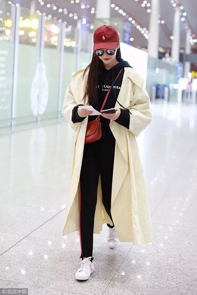 唐嫣米白色宽松风衣外套内搭黑色连帽卫衣,下穿侧条纹黑色运动裤,脚踩运动小白鞋,酒红色单肩包和棒球帽和裤子的条纹颜色呼应,整体摩登有型。