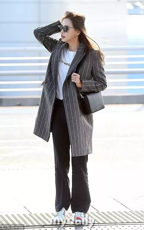 李哈妮则用灰色竖条纹呢子大衣配阔腿裤,脚踩Adidas白色球鞋,优雅韩范儿~