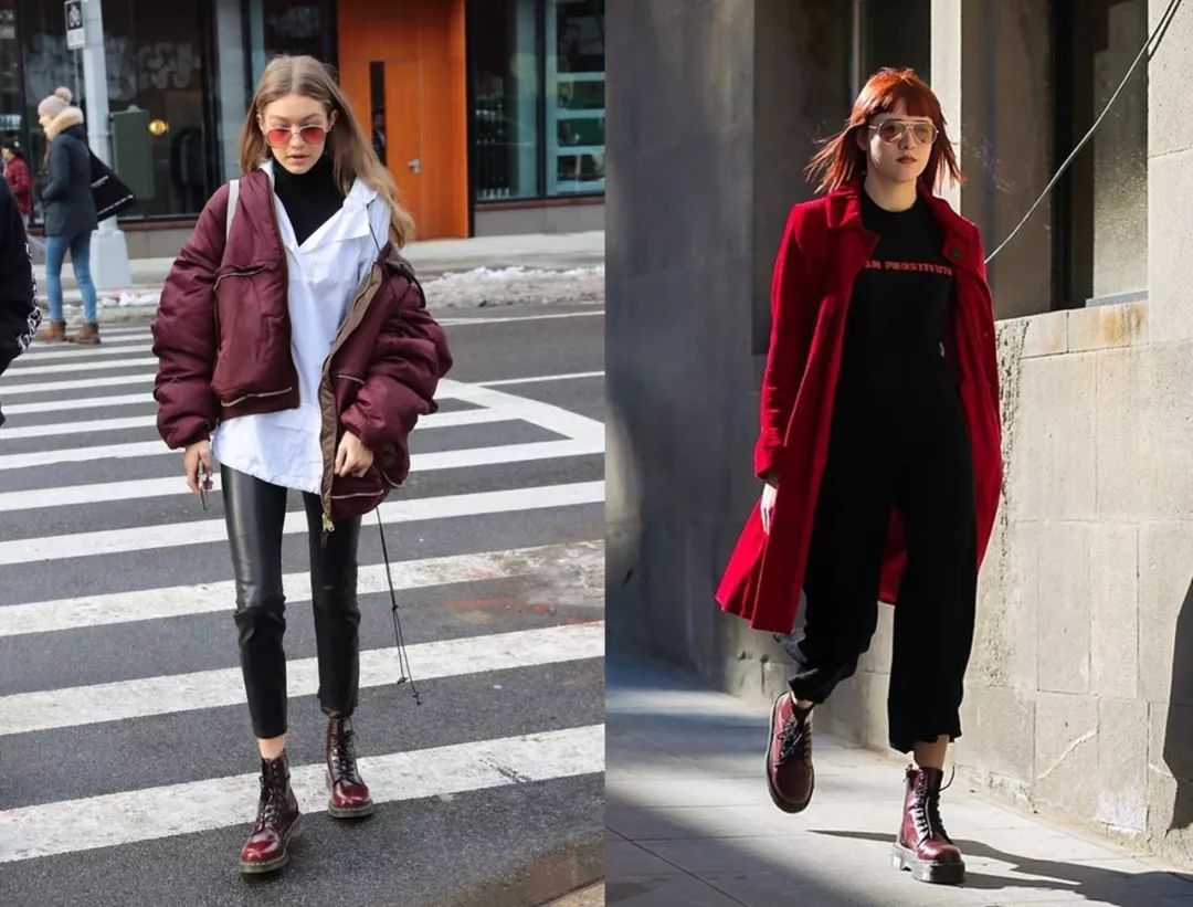 除了黑色,酒红色的马丁靴也是很经典的款式,在搭配时还可以做做呼应显得更高级!▼
