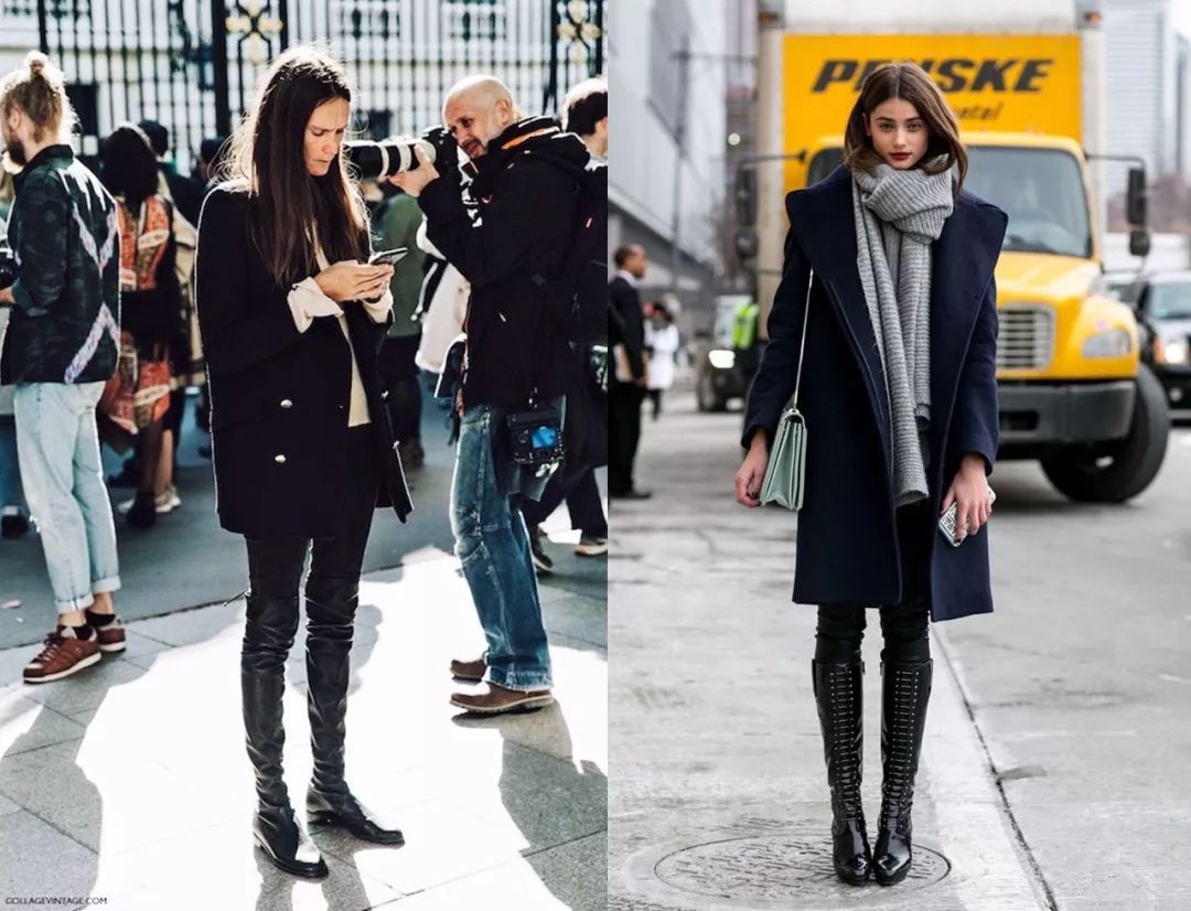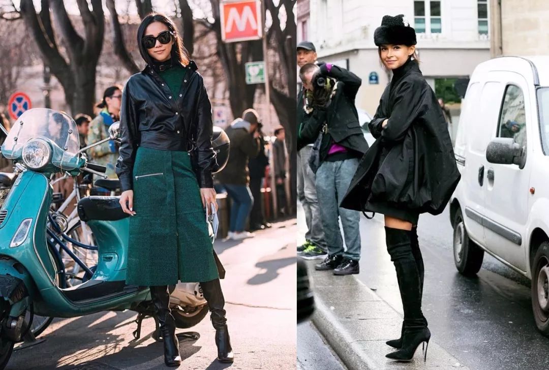 和黑色紧身裤做黑色的加法,可以在视觉上延长腿的长度,从而会有很显著的显高效果!▼