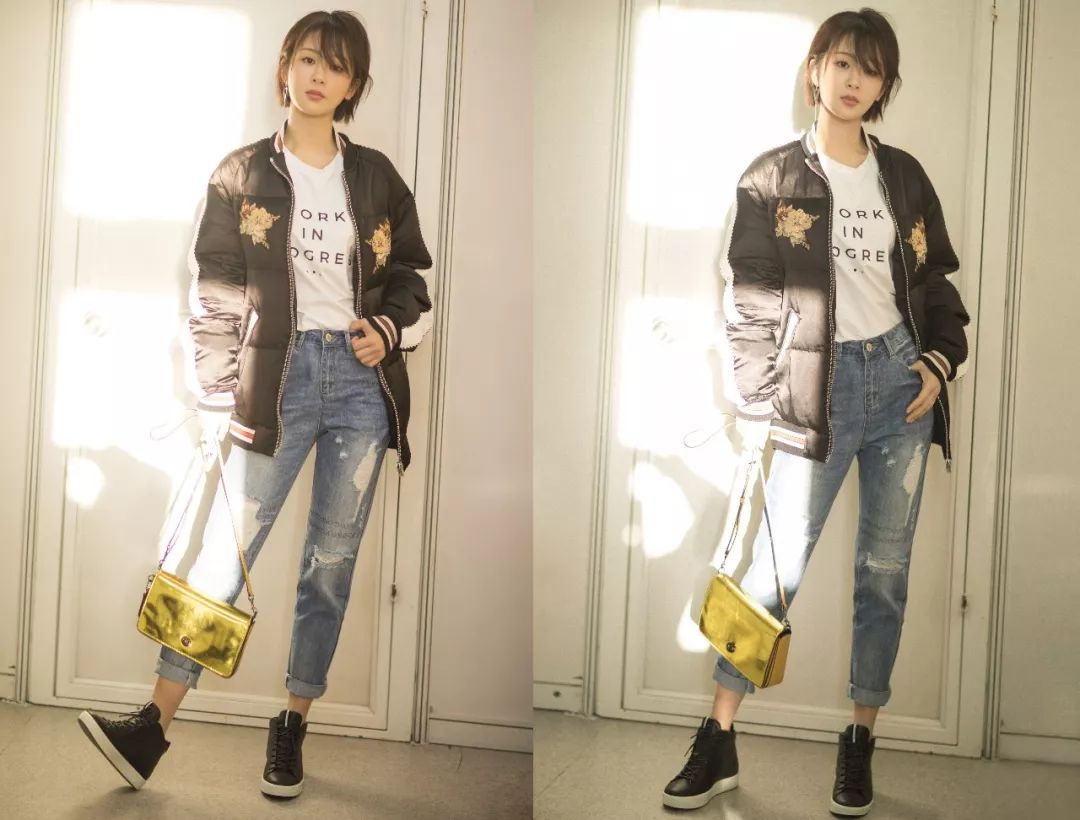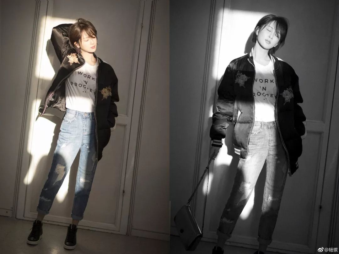 杨紫白T加牛仔,外搭coach黑色棉服,也是配上ECCO Soft 8小黑鞋,整体帅气又俏皮▼