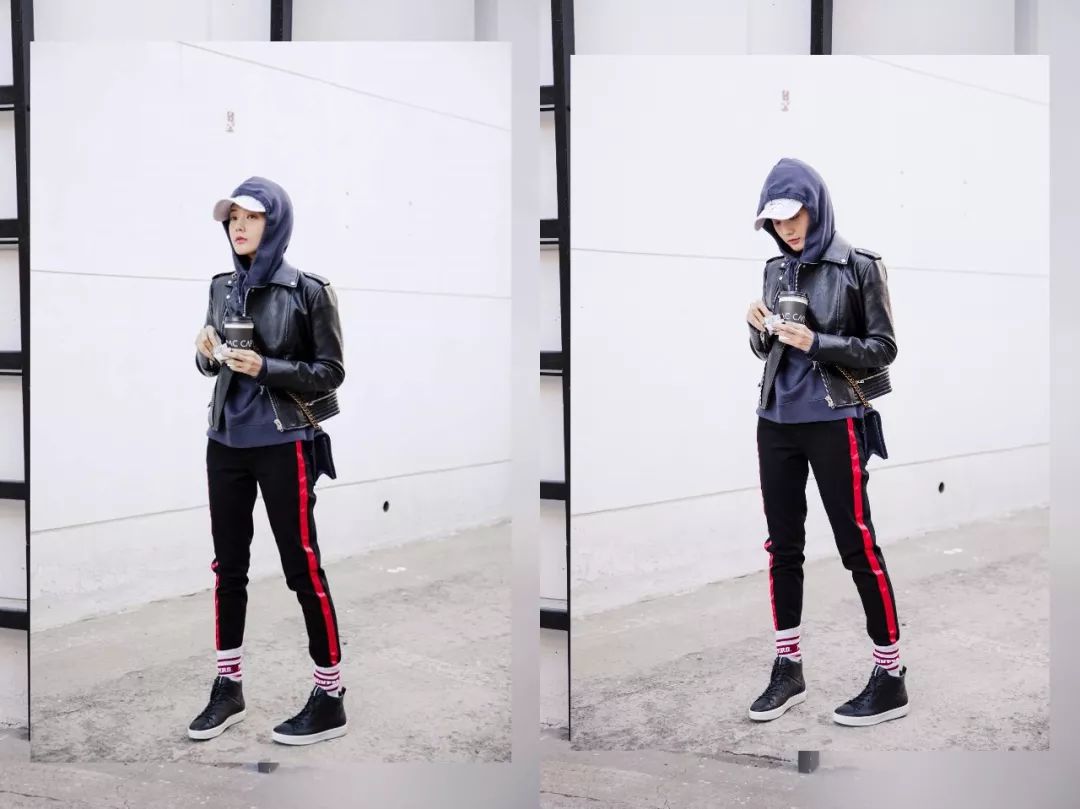 休闲街头范也是小黑鞋分分钟就能演绎的!李一桐连帽卫衣和运动裤搭配,外面鞋子则选择了ECCO Soft 8小黑鞋,整体造型不能再酷了!▼
