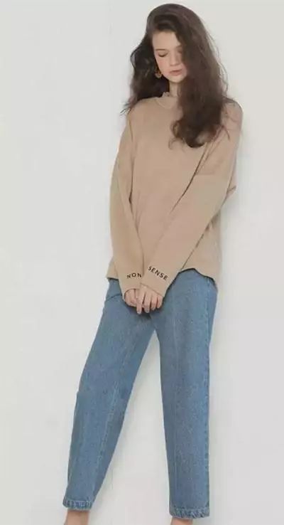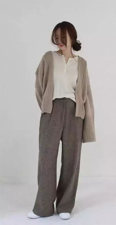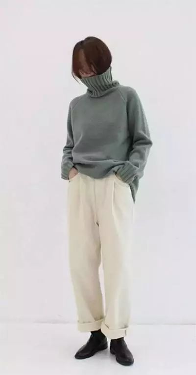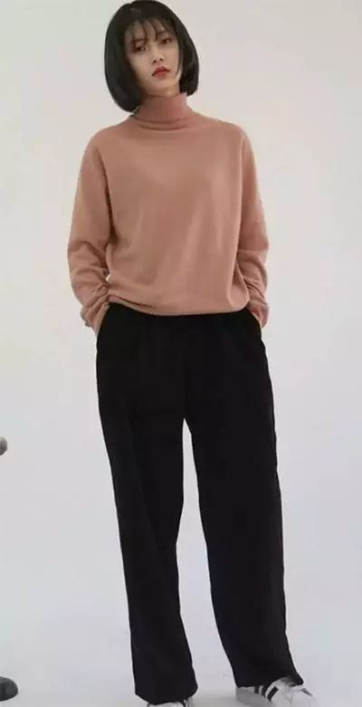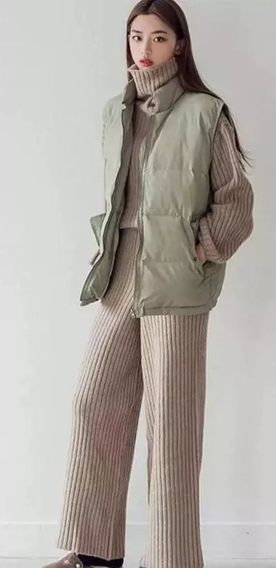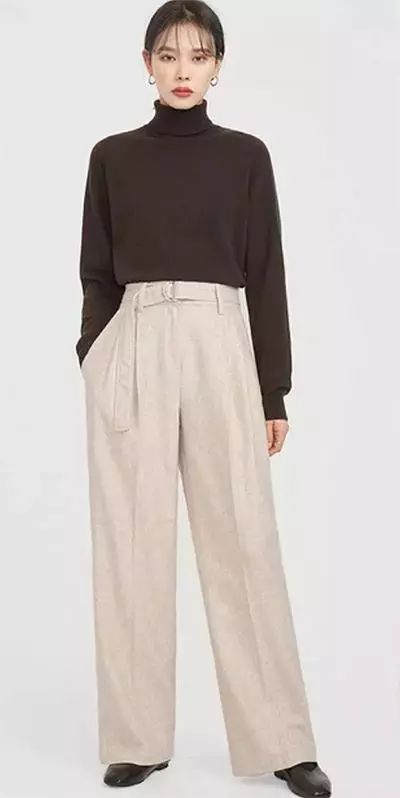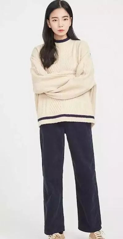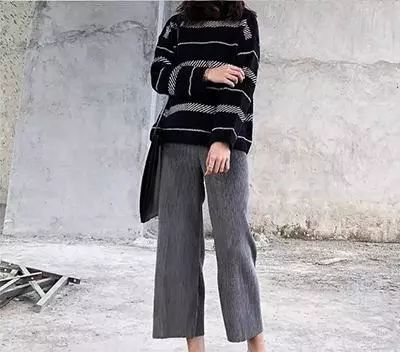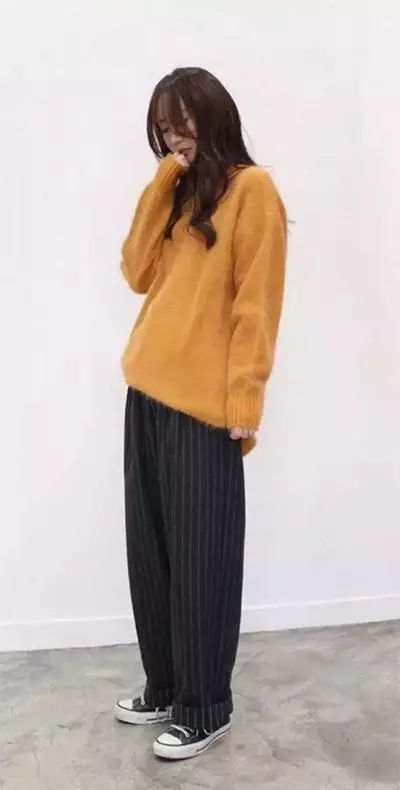 姜黄色的毛绒衫搭配竖条纹的阔腿裤,
