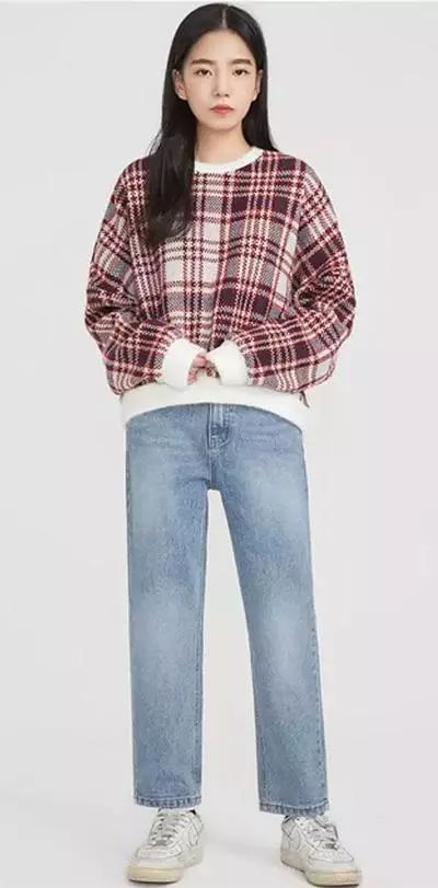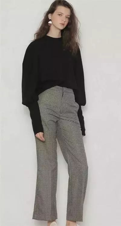 黑色打底衫搭配格纹系列的微喇阔腿裤