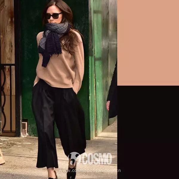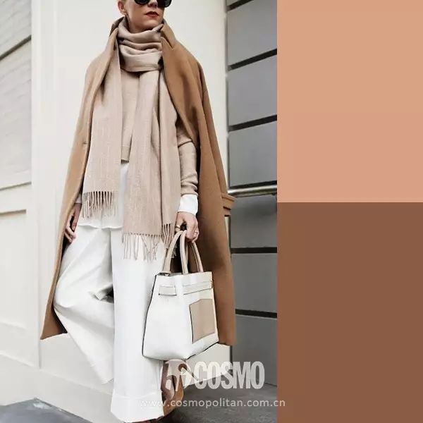 其实这两种算是比较接近的两种配色,驼色和浅咖啡色构成最高级的同色系穿搭。