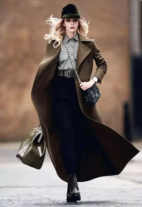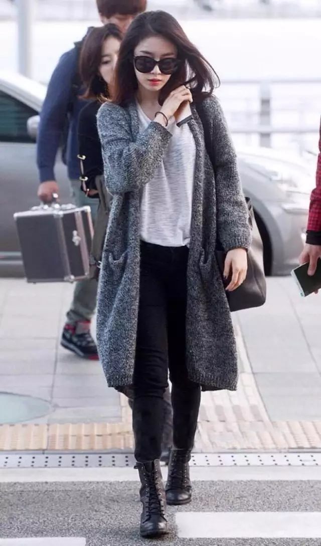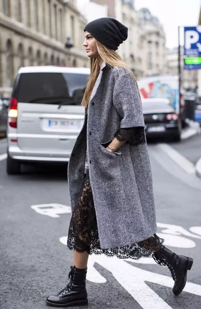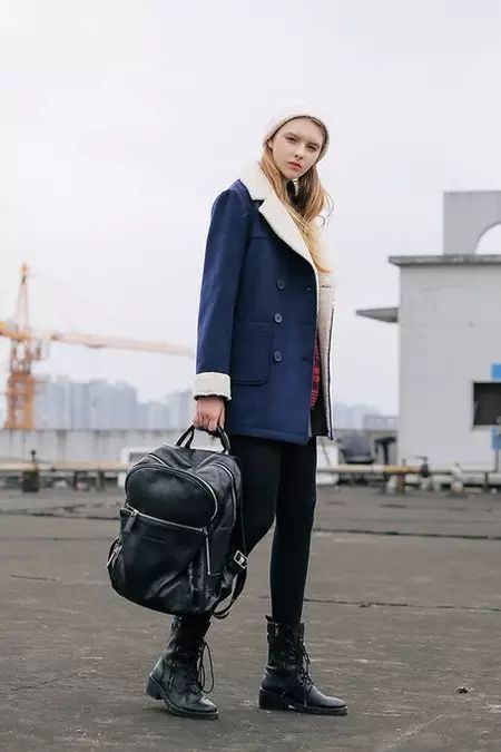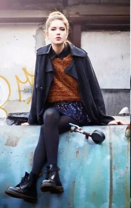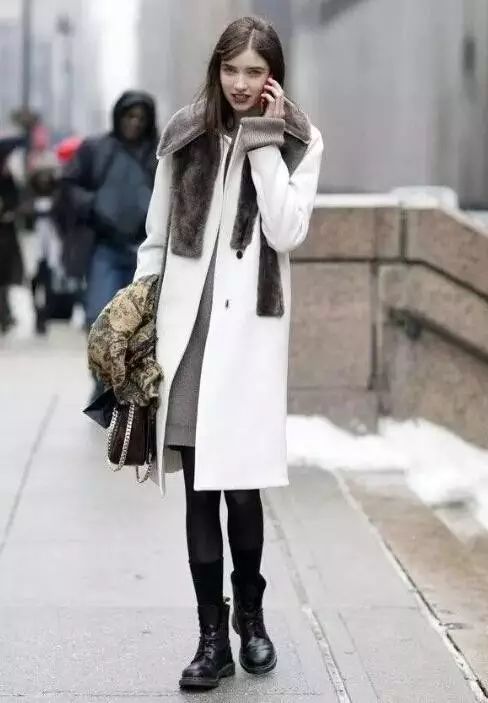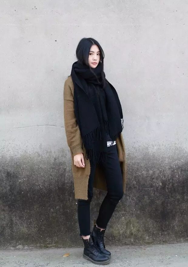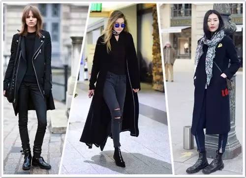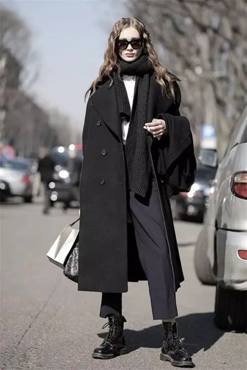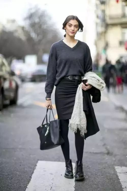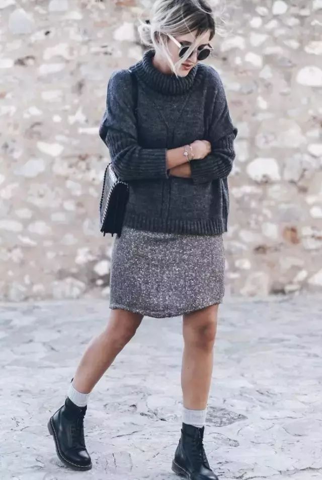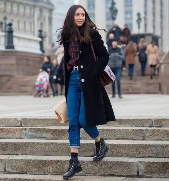 黑色马丁靴,在视觉上拉长了腿部比例。上衣的搭配以简单为主,一件夹克、针织开衫,甚至一件大衣就可以了。