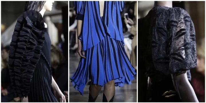 褶皱、荷叶边、羊腿袖等柔软的曲线线条设计中,始终蕴涵着现代化设计语言里的笔直线条。仿佛是整个系列内在的钢筋,无论建筑的外立面造型扭曲、变形、灵动,坚实的主心骨始终不变。