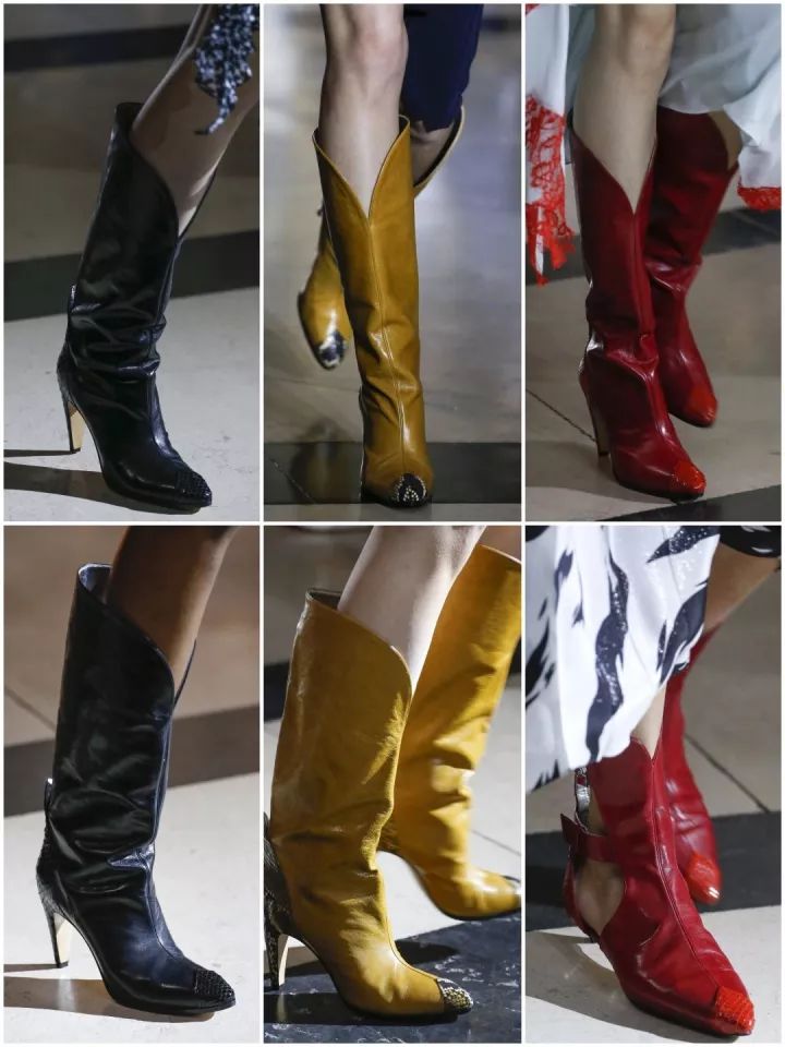 皮革靴是GIVENCHY本季的主要鞋款,长短不一的皮革靴紧紧的包裹住女士的脚踝到膝盖以下的小腿部位,“V”字形的正面裁剪径直的呈现出这些皮革靴的干脆利落,又彷如一朵绽放的花瓣,与剪去部分的裸露共同为小腿处的性感加分。