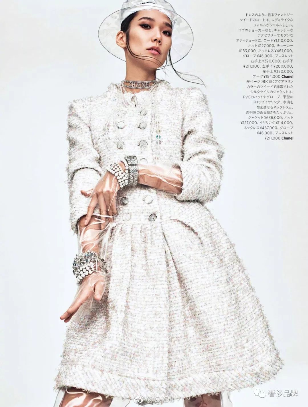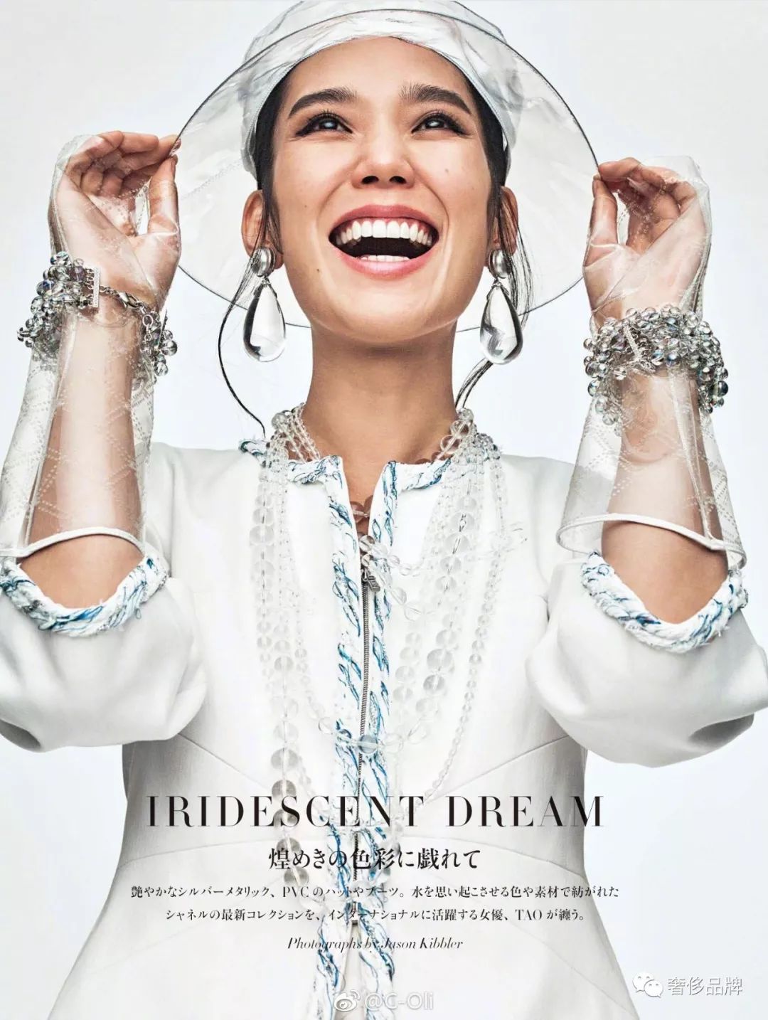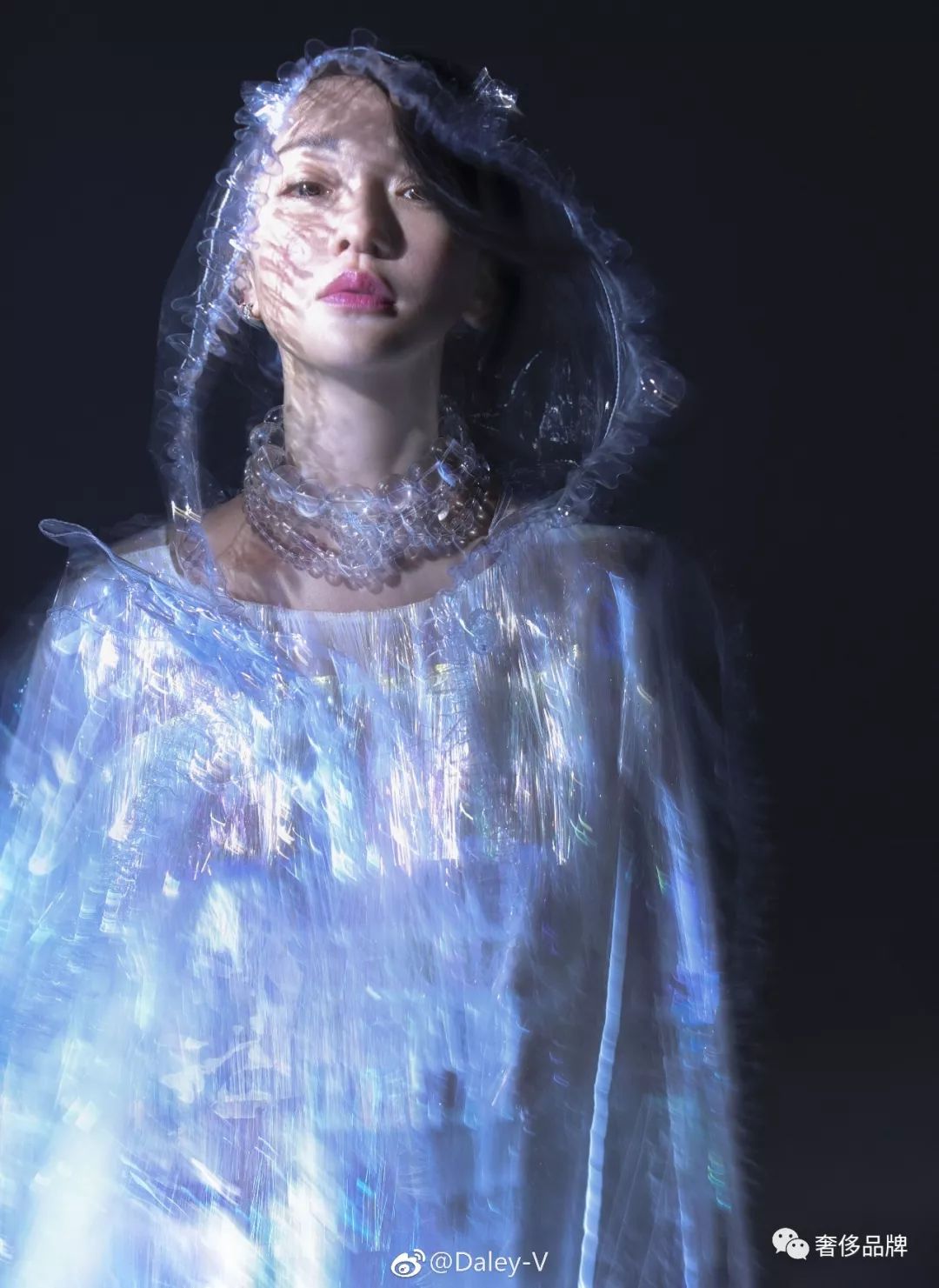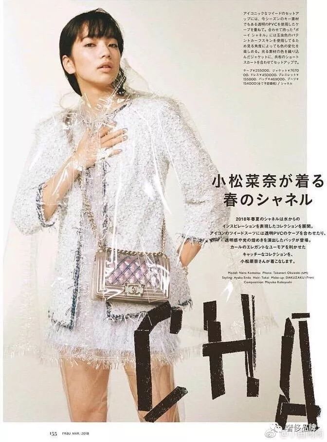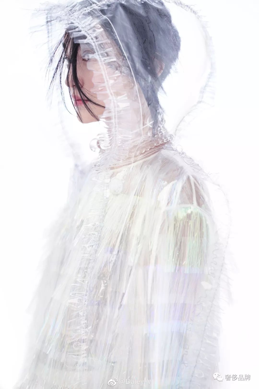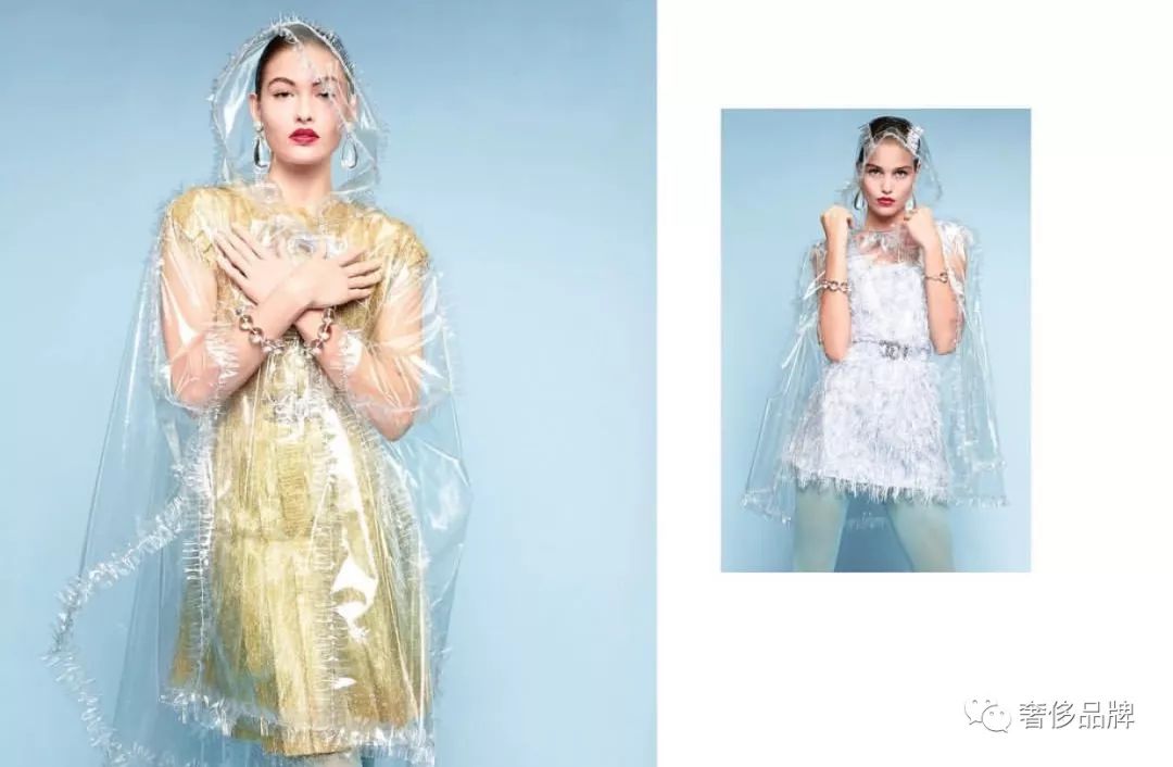 周迅在杂志大片中将这件大型的“塑料雨衣”诠释的迷离且文艺,作为形象大使果真是最适合的。