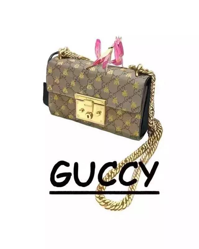 Guccy 是名副其实的正品,它是 Gucci 的中世纪拼法(这么一听更复古了吧)。而且,当季的最新款式是根据文艺复兴时期,刻画在新品上,运用 "Guccy" 一词也恰好更加的复有古典 feel。