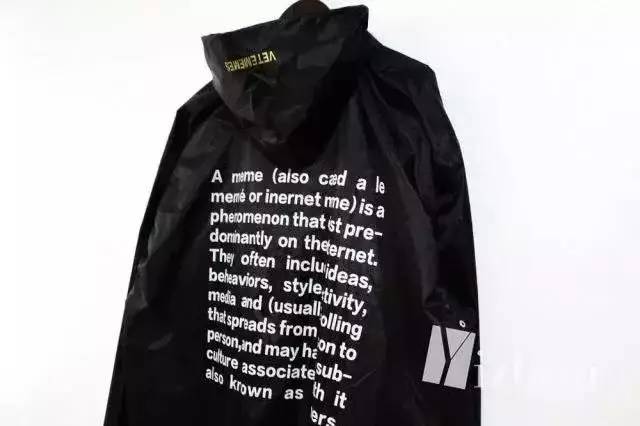 Vetememes推出过一款雨衣,大致是解释一下meme的意思,但讲真,如果不仔细看,还真的以为是Vetements。