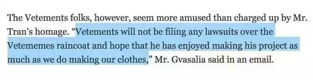 对此,Vetements 创始人 Demna Gvasalia 不但没有发出侵权警告,反而给了 Vetememes 的负责人一记助攻,让他 enjoy····(背后一阵凉风····)