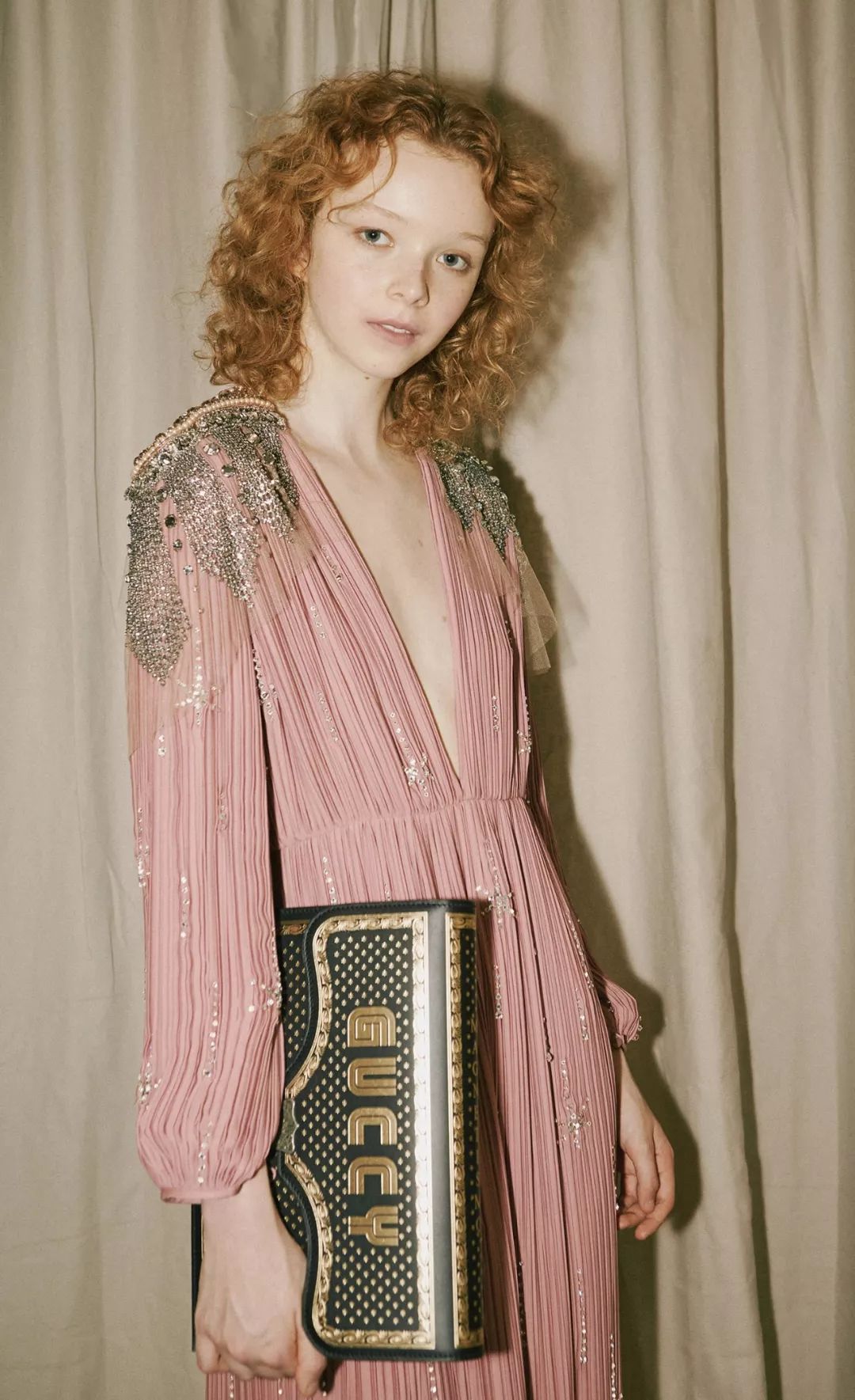而这正是 Gucci 2018春夏系列所为,拒绝另起篇章,执着地专注于诠释缓慢之美。错综复杂的认同纷纷兴起,抗衡着范畴、分类,以及毁灭性的界限。于此而言,我们创造出的是歌颂自主的欢愉诗篇。