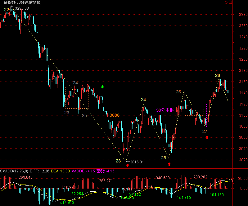 )用60分笔之间的同级别分解分析,25-26和27-28比较,是否盘整背驰,今天中午结束时,背驰很明显。从笔形成的中枢(近似看成30分中枢)的角度看,23-24和27-28也是盘整背驰的。