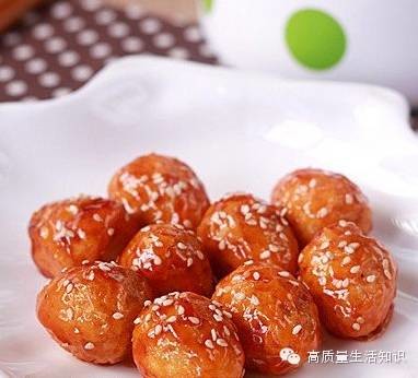4.锅烧热后倒入糖水轻轻搅动熬成汤汁,待其变稠时,再倒入丸子翻滚均匀,让每个丸子都裹上糖汁即可。最后盛出盘中就可以啦!