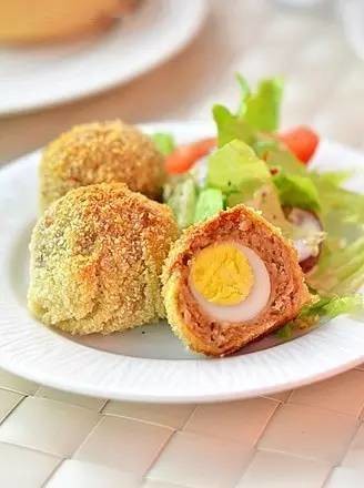 1.将煮熟的鸡蛋剥壳,裹上一层面包渣,淋一层蜂蜜,再裹上一层肉松,最后再滚上一层面包渣。