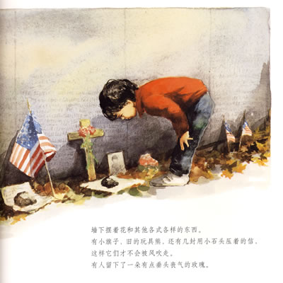 位于华盛顿特区的越战纪念墙,上面刻着五万八千个士兵的名字,他们都是在越战中牺牲或失踪的。小男孩和爸爸从很远的地方到这里来,花了很长的时间在墙上寻找爷爷的名字,然后在一张纸上,用铅笔把名字拓下来,郑重地带回家。