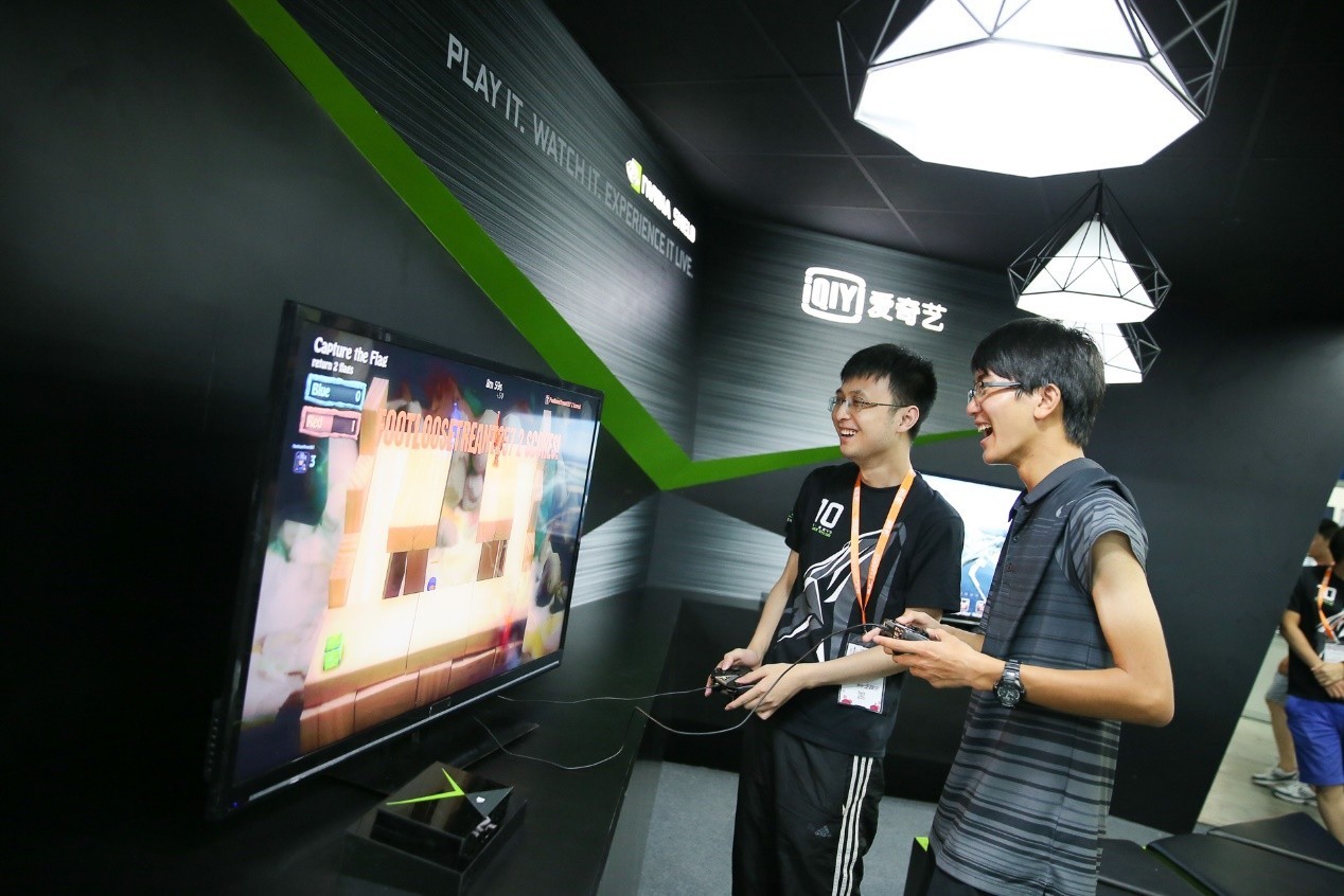 在NVIDIA展台还能体验搭载Tegra芯片的Shield TV,Shield TV的GameStream功能可让你将PC上的Steam游戏串流到电视,直接在电视上玩PC游戏,支持使用爱奇艺观看热播电视剧。当然也支持原生Android游戏,现场提供了《真实赛车3》、《NBA Jam》等精品游戏,让你乐翻天。