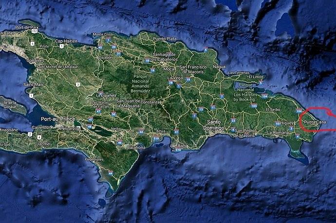 蓬塔卡纳机场(PUJ)位于多米尼加的东部,见图红色标记处。