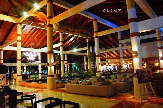 多米尼加共和国属于热带海岛,这里的建筑和这里的天气、人们的笑颜一样,处处洋溢着热带风情。主要体现就在于就地取材、通风透气。前者表现于很多建筑都是用多米尼加遍地都是的棕榈树椰树和芭蕉树叶建成的木制茅草房,后者表现于大厅不会包裹得十分严实,而是处处透气,与外界的空气对流。机场的到达大厅是这样,我们酒店的大厅也是这样。