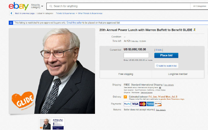 被叫停的“股神”巴菲特午餐,已于6月13日正式开拍,起步价约为17万,目前已有8次出价,竞价已高达2000万,直至17日,这场午餐的拍卖所得将会全部转至格莱德基金会用作善款事业。