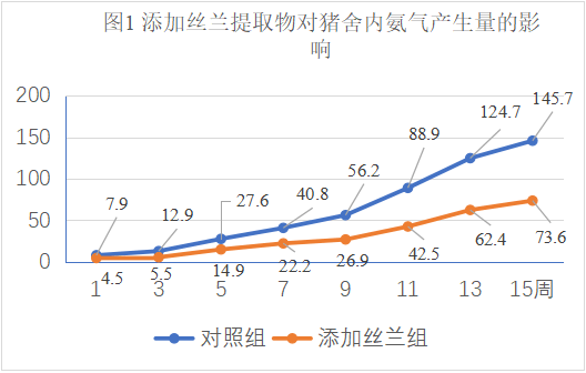 图1显示,猪舍内氨气产生量随时间的增长,添加丝兰提取物-优兰宝组和对照组氨气产生量都在增加,但是添加提取物组的氨气产生量显著低于对照组。