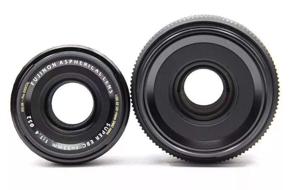 如果你还没看懂的话,直接记住结论就好了:我们可以通过“等效系数”粗略比较不同画幅相机 镜头的视角、虚化能力和弱光信噪比。比如下图所示的两款镜头,他们具有基本相同的等效规格(约为50mm F2.1),通光孔大小相同(很直观吧)。虽然对应机身的感光元件尺寸差别很大,但实际拍摄的虚化能力和弱光信噪比是基本相当的。