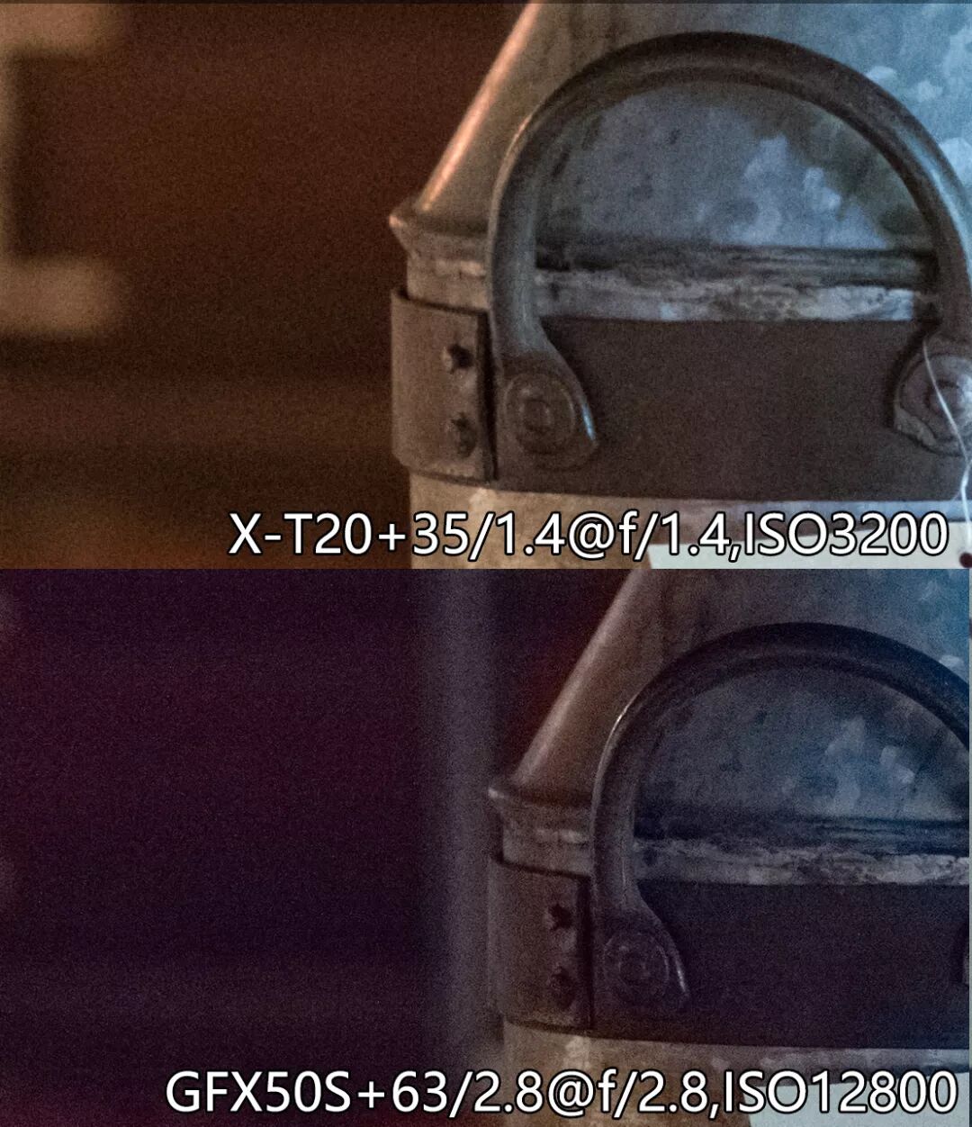 换言之,在环境亮度、曝光时间相同的前提下,如果两个相机系统的镜头通光孔面积相同,那么它们所拍摄照片的信噪比应该是基本相当的。对于大画幅相机来说,想要让通光孔面积与小画幅相机相同,就需要使用较小的F值。根据曝光三要素,快门速度不变、F值变大(光圈变小),那么感光度就会提高——这与我们的直观感受相同:单反、无反相机在高ISO下拍摄的照片,有时候与手机使用低ISO拍摄的照片噪点水平接近——而这个“有时候”,就是“等效光圈”相同的时候。