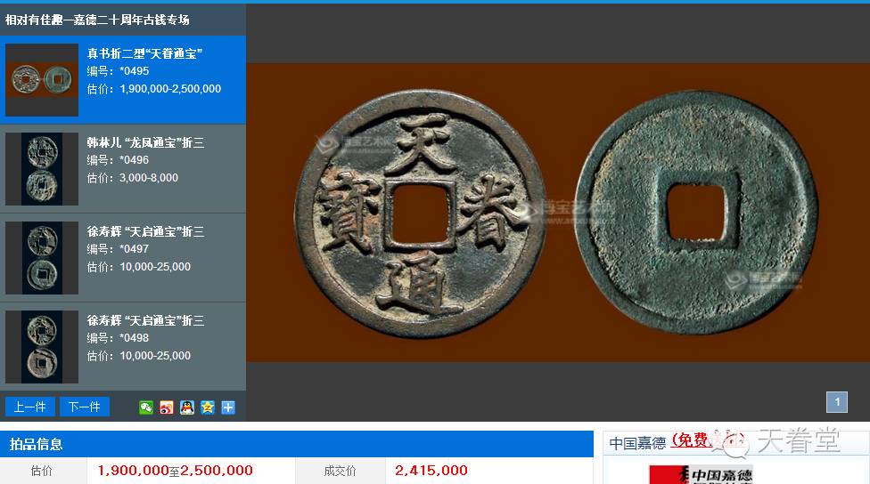 2013年04月,这枚天眷通宝折二细缘事隔6年再次步入嘉德拍卖场。那时国内经济持续低迷,但该钱依然以240余万元的骄人价格再次轰动收藏界。
