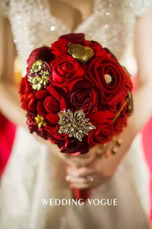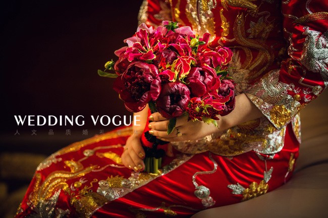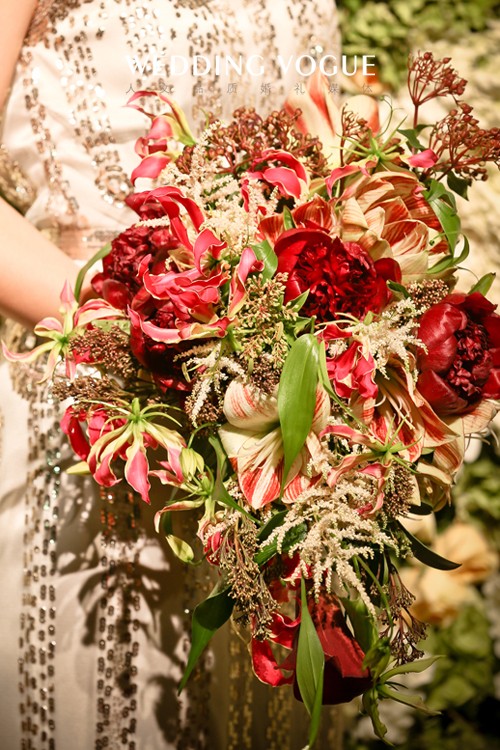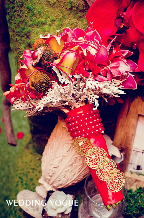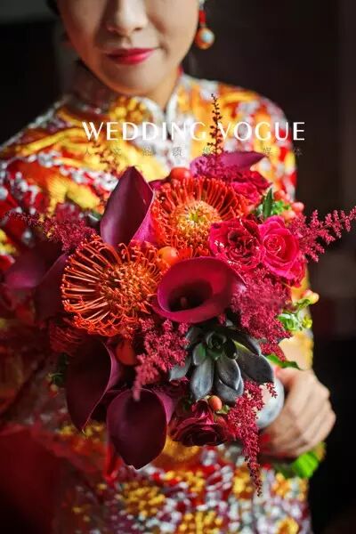 代表着喜庆、热烈、团聚的红色是最具有中国传统婚礼文化特色的色彩。红色系捧花从细节处彰显着中式华美的古典韵味。