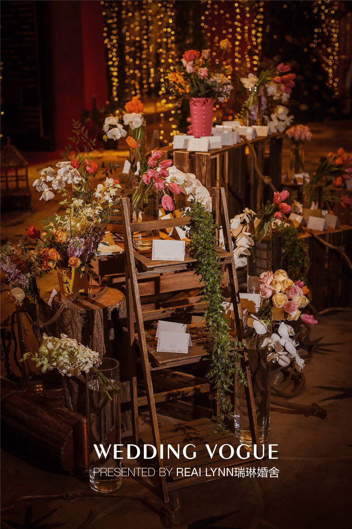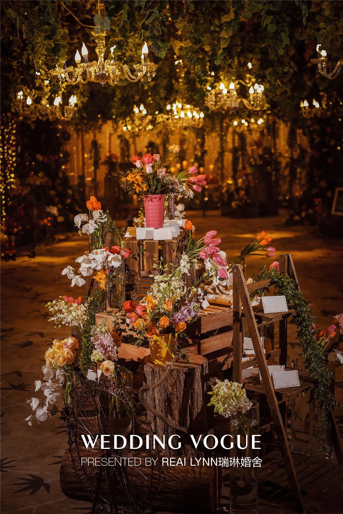 在场景设计上,用全覆盖的搭建去打造现场的梦境,力图把整个迎宾区改造成一个丛林。直接运用水晶灯的暖黄色光源,去营造太阳透过丛林,露出的斑驳阳光的效果。因为水晶灯的运用,仿佛也置身在魔幻的古堡森林当中。当然,暖光的运用还透露出一个小心机——让爱自拍的女宾客自带美颜效果。