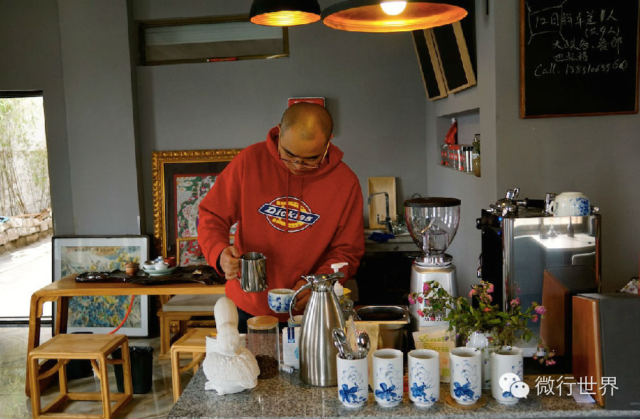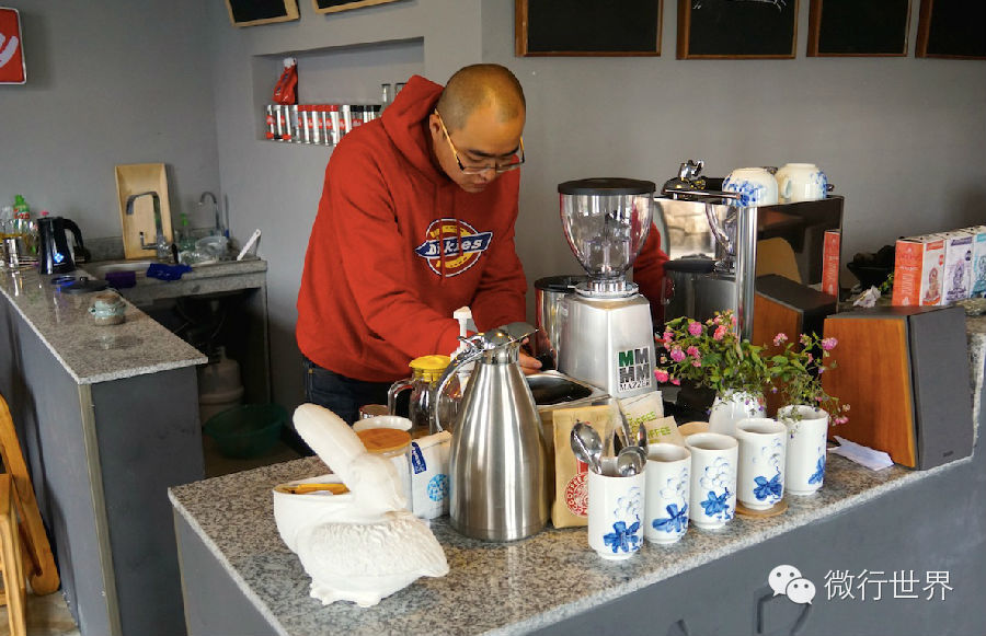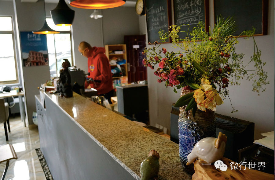 “你渴不渴,我给你泡杯咖啡”说完小丁就去给我创作了一杯卡布基诺。我用“创作”这个词,是看到小丁在整个制作过程中那份认真专注的表情和享受愉悦的神情,也许这于他不只是一杯咖啡,而是一种生活。他说他是之前在成都跟着一个开咖啡店的朋友学的,后来开了客栈以后有些客人也会教他怎么做好咖啡。