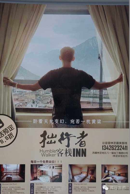 这算得上是一家很多文艺青年比较喜欢的客栈。清晨的时光,坐在这里,简洁的吧台上放着几盆绿植,空气里飘起了咖啡和民谣的味道,张玮玮的《米店》唱着“窗外的人们,匆匆忙忙,把眼光丢在潮湿的路上 ”。墙壁上贴着用心设计的客栈海报,几个年轻人在这里或看书,或敲打着电脑。时光和这林芝的天一样,干净透明。