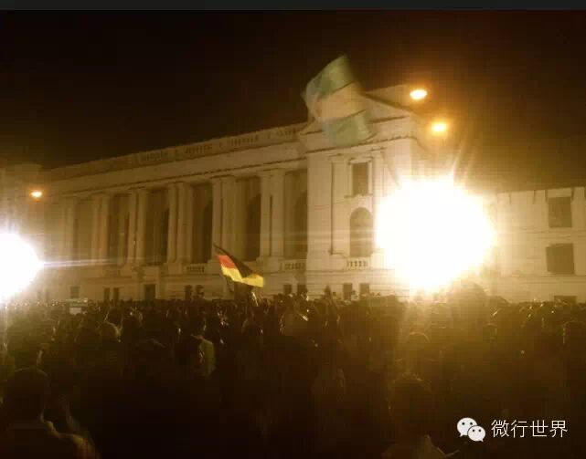 晚上快十点,我们来到了传说中的杜巴广场,我一下子惊呆了。满广场有近万人,男女老少,脸上无不洋溢着节日的欢乐笑容。有些人高举着德国和阿根廷的旗帜挥舞着,有些人穿着国家球衣聚集在一起一遍遍高呼“Germany”“Argentina”,有些人拿着颜料在脸上绘画出决赛两国国旗的图案。而我也在朋友的鼓动下,毅然选择了疯狂一把,把整个脸都画成了德国国旗的图案。然后,加入到了他们的狂欢中。