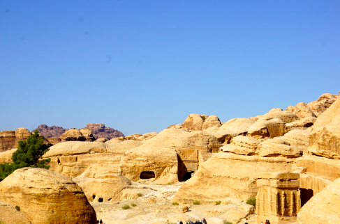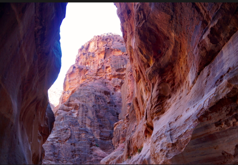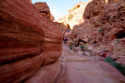 第二天早上九点,在花了将近500人民币的门票代价后,我们顺利进入佩特拉古城,果然,刚刚进入就是一片片略带有粉红色的岩石山脉,石头上星星散散刻着一些图案。这条峡谷,两旁岩壁上出现很多空洞,据说凿岩而成的墓碑群。这些墓碑群根据所有者身份的不同而规格不一,雕刻的图案也各不相同。沿着山体往里走,粉红色慢慢加重,接近玫瑰红。