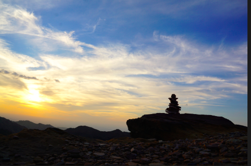 我壮了壮胆子,选择了一块悬崖石头坐了上去,两腿悬空吊着,低头时看见万丈深渊有些胆战心惊,但抬头看前面落日西下便变得心平气和。我想,此时此刻,我的身体悬在“世界尽头”的边缘,世间最大的光辉徐徐落下,一切都将归于黑暗之中。消失,终将消失,这山,这日,这世间万物,连同我一起就要消失在了这一片黑暗中。