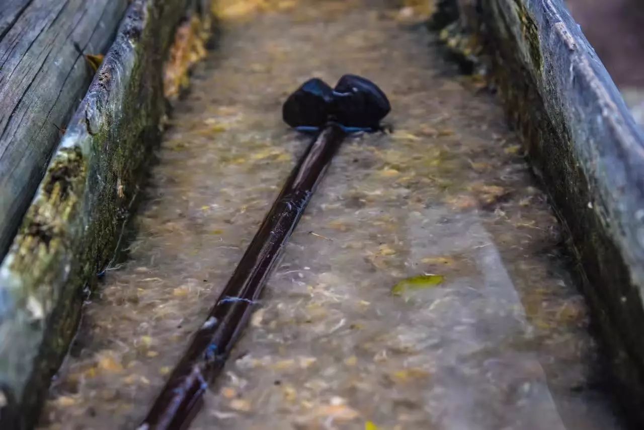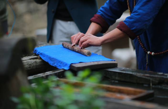- 把洗净的皮料置于石板上,反复捶打,直到打成纤维状,入水完全散开为止