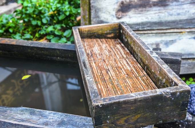- 将纸帘放入盛水过半的木槽中,在溢满清水的纸帘上倒入适量的纸浆,用手轻轻搅拌、拍打,使纸将纤维均匀分布