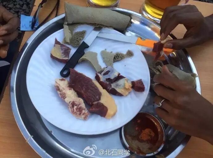 埃塞俄比亚是个有着3000年文明历史的古国,当然饮食文化也会比较复古原始。北石在这里曾经尝试过一种几乎所有当地人都喜欢吃的食物——“C嘎”。但是你尝试过就会知道是生牛肉。因为埃塞俄比亚的当地人超级喜欢吃生牛肉,所以店里经常会将整头牛挂在钩上,然后让食客们用刀将牛肉割成小块然后用手抓着蘸酱吃。这个酱简直是提升了口味~个人觉得吃起来还不错。