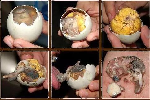 越南的毛鸭蛋说白了,就是一只还未发育完全的鸭胚胎。是越南北方人较为喜欢吃。据说,最好吃的是鸭嘴和脚爪都已显雏形,是最补的。反正北石算是明白了,很补的就是能吃的!
