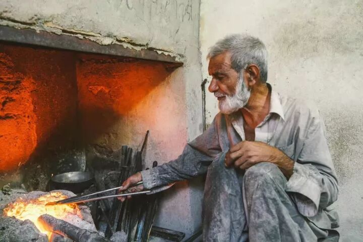 在白沙瓦,早就耳闻一位老人,看似普通,却拥有着几十年的冶金手艺,我充满好奇地来到了他的冶金室去拜访。我看见他时,他正在打盹,我等了一会,他醒来热情地招呼着我,随后坐在火炉旁,像个孩子一样单纯可爱。
