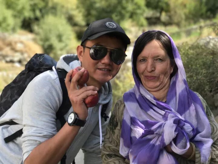 大妈弯腰将地上的果子捡起来,用自己的头巾包住,朝我小跑过来,比划着让我们拿兜里的果子,那是一个个红彤彤的苹果。不会英语的她指着高处作饮水状,大概是想表达山顶很远,你爬山很累,要多喝水多吃果子。